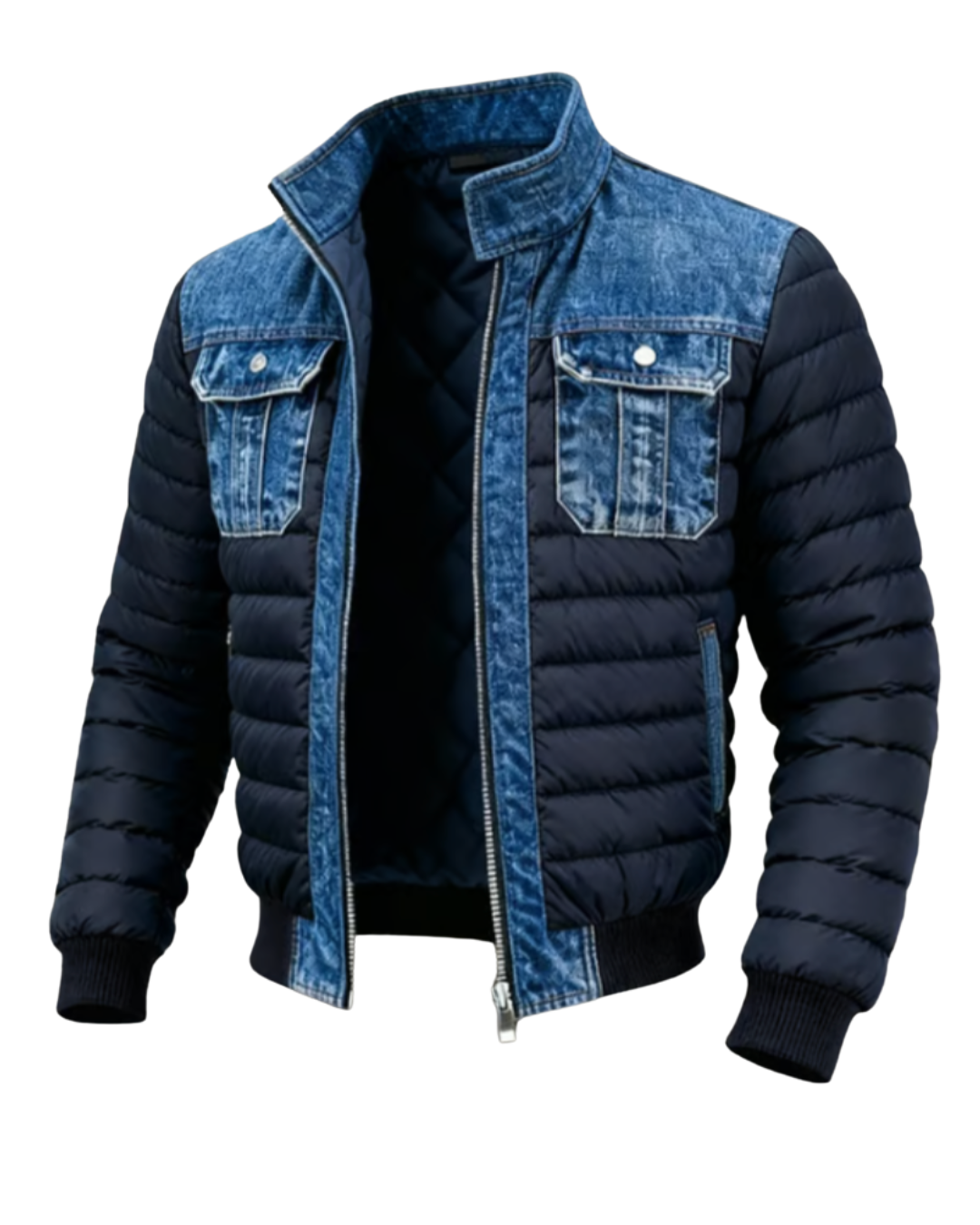 This hybrid jacket, crafted from denim and quilted fabric, brings together the perfect blend of style and functionality.