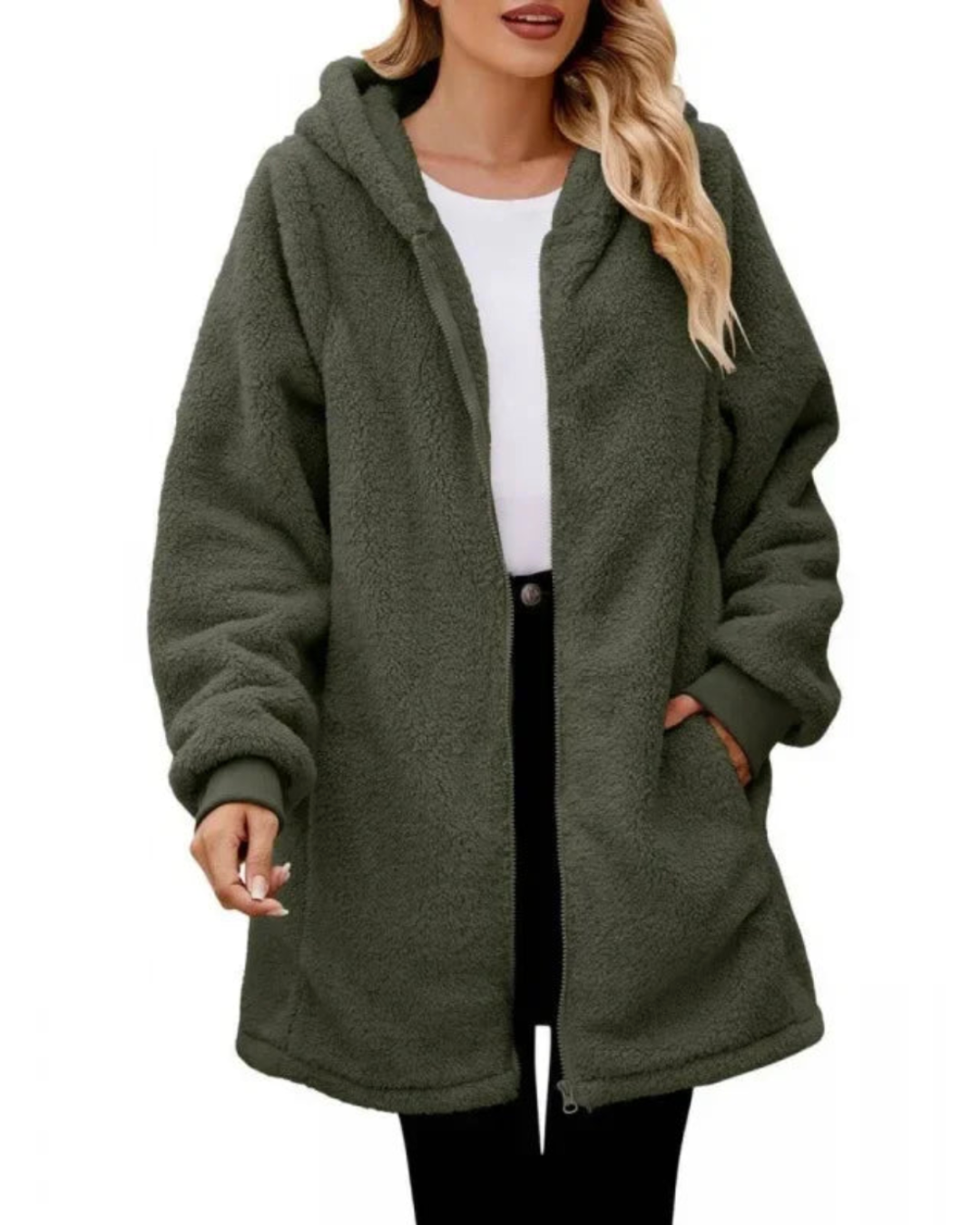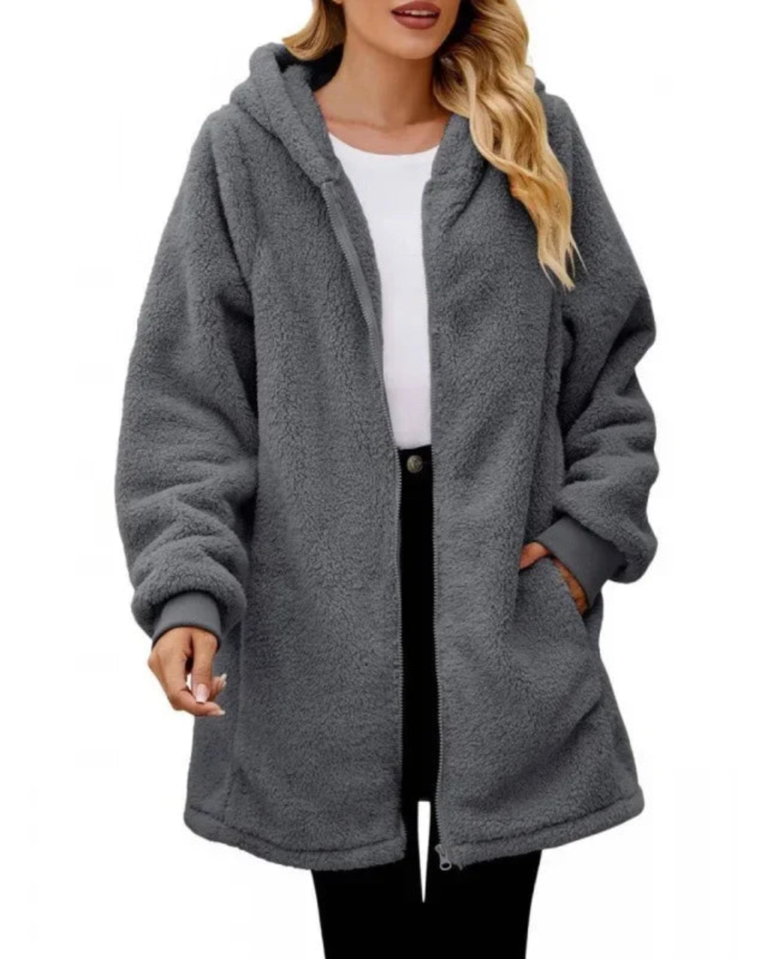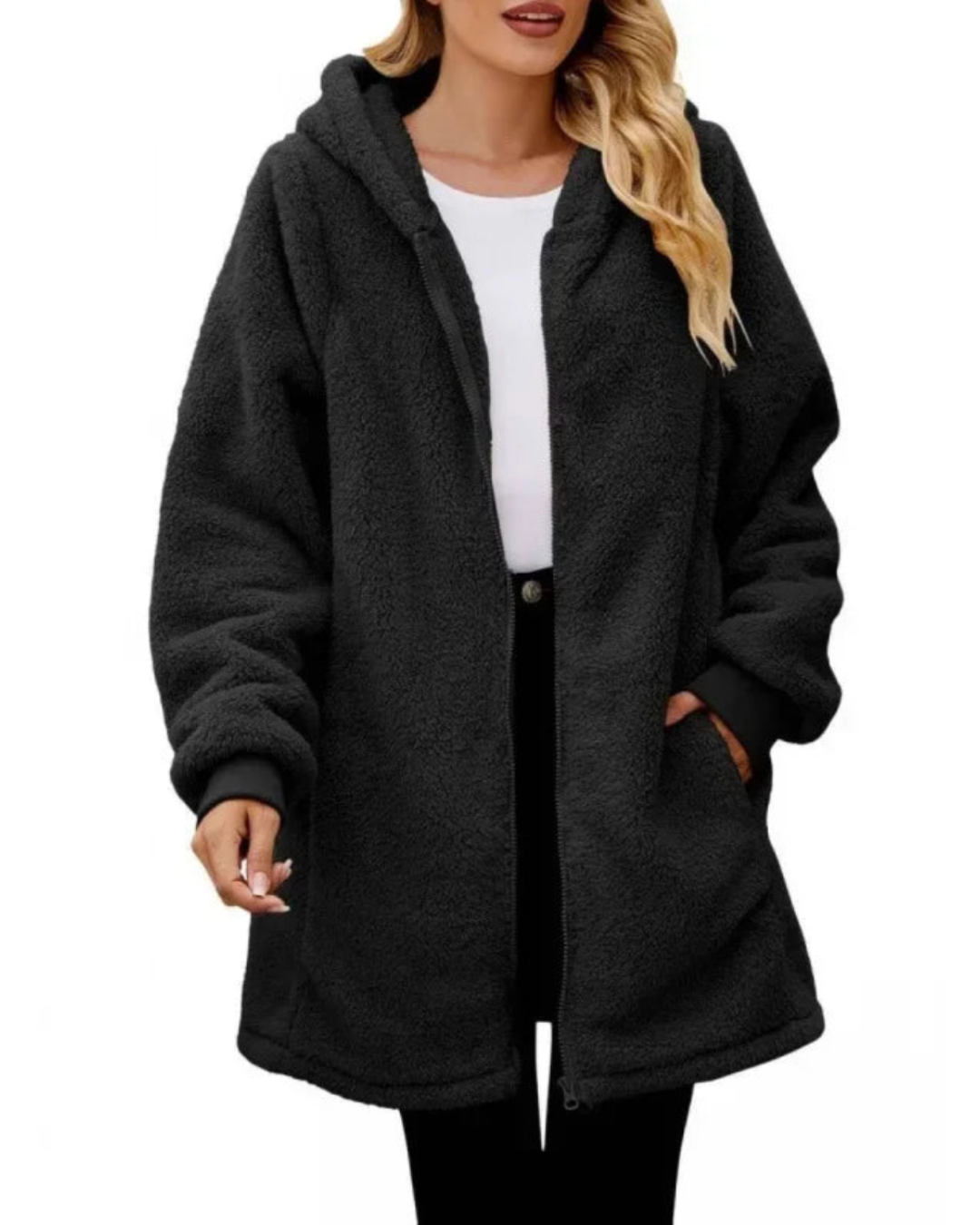 Warm, soft, and incredibly cozy to the touch – this fleece jacket with a hood is your reliable companion for cooler days. It envelops your body in soft fleece, providing comfort and freedom of movement without feeling restrictive. Perfect for walks, daily outings, or relaxing at home.